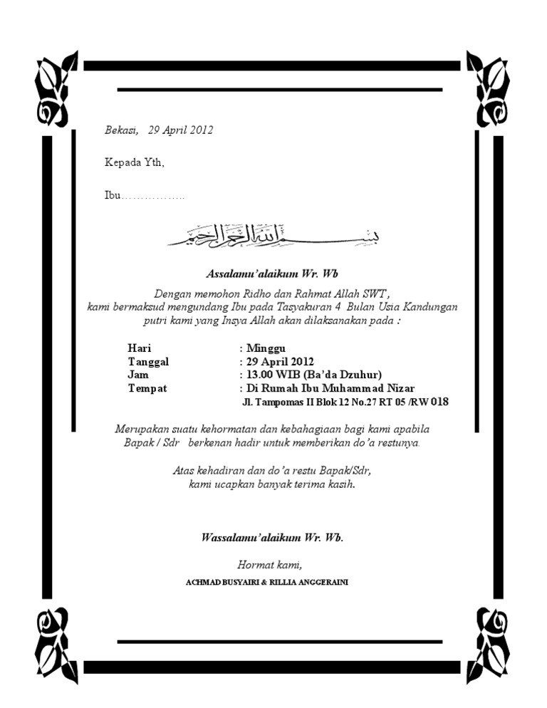 Wb dengan memohon ridho dan. Ada berbagai jenis souvenir yang sering digunakian. Alhamdulillah juga acaranya lancar, banyak banget yang dateng.banyak yang ngedoain, rezeki untuk calon baby ku jg banyak banget. 76.00 kb, file name : Syukuran 4 bulan kehamilan assalamu'alaikum wr wb abdul manan & ibu astin syukuran 4 bulan kehamilan assalamu'alaikum wr wb, bismillahirrahmanirrahiim puji syukur kami panjatkan atas karunia dan hidayah yang telah diberikan allah swt kepada keluarga kami. Kartu ucapan syukuran 4 atau 7 bulan kehamilan mitoni tingkepan. A short summary of this paper. Syukuran 4 bulan mengandung istri bpk h masrukin di isi tausyiah oleh kyai ahmad wahyudin. Undangan syukuran 4 bulanan contoh undangan walimatul hamli file ms word a4 1l 01 solution ngnet undangan tasyakuran 4 bulan kehamilan syafiqoh undadown. Bagi anda yang sedang membutuhkan template undangan syukuran 4 bulan kehamilan (walimatul khamli) atau anda sedang membutuhkan referensi dari bentuk undangan tasyakuran kehamilan. Blablablablablablnal blablablablablablnal blablablablablablnal blablablablablablnal blablablablablablnal blablablablablablnal blablablablablablnal. Stiker label custom syukuran 7 bulanan nujuh bulan shopee indonesia. Bekasi, 29 april 2012 kepada yth, ibu…………….
